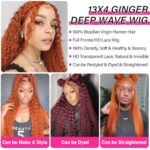 • 【Ginger Lace Front Wigs Human Hair Material】12A Grade Ginger Deep Wave Wig Human Hair,100% Brazilian Virgin Human Hair ,All Cut From Young Girls Donors, Soft And Comfortable, Can Be Straightened,Dyed, Bleached And Restyled As You Like